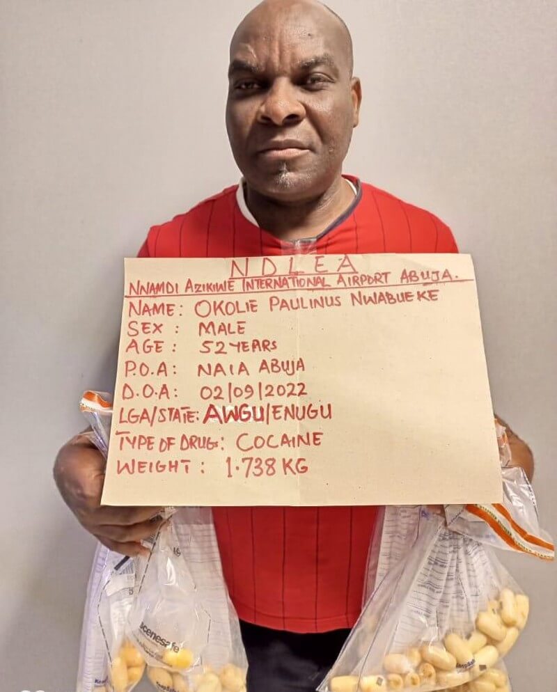 A Brazilian returnee and father of two, Okolie Paulinus Nwabueze, has been arrested at the Nnamdi Azikiwe International Airport (NAIA), Abuja by operatives of the National Drug Law Enforcement Agency (NDLEA), for importing Ninety Two (92) wraps of cocaine, which he ingested and eventually excreted after days under observation in the Agency’s facility.