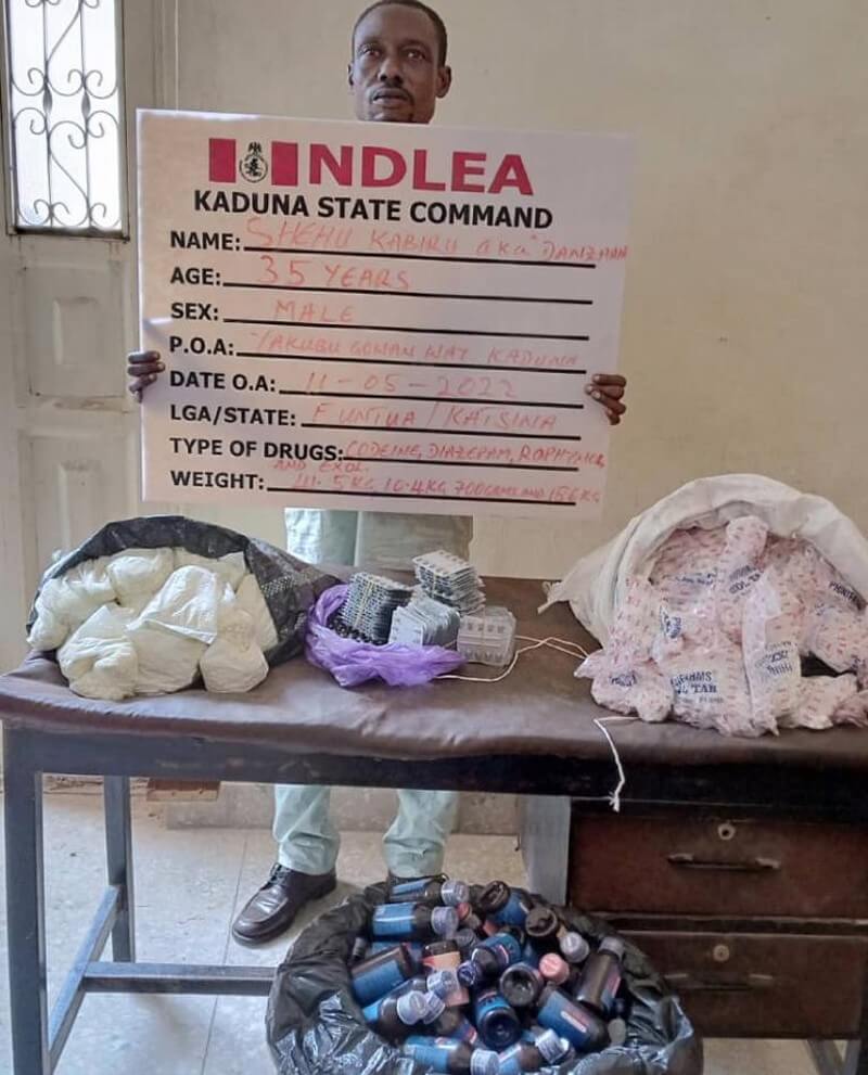 On the same day, NDLEA operatives in Kaduna arrested a notorious drug dealer, Shehu Kabiru a.k.a Dan-Zaira, wanted by the Kastina Command of the Agency for jumping bail. Recovered from him include: 45,000 tablets of Diazepam weighing 41.5kg; 50,000 tablets of Exol, weighing 15.6kg; 1,500 tablets of Rohypnol weighing 700 grams and 300 bottles of codeine weighing 41.5kg.