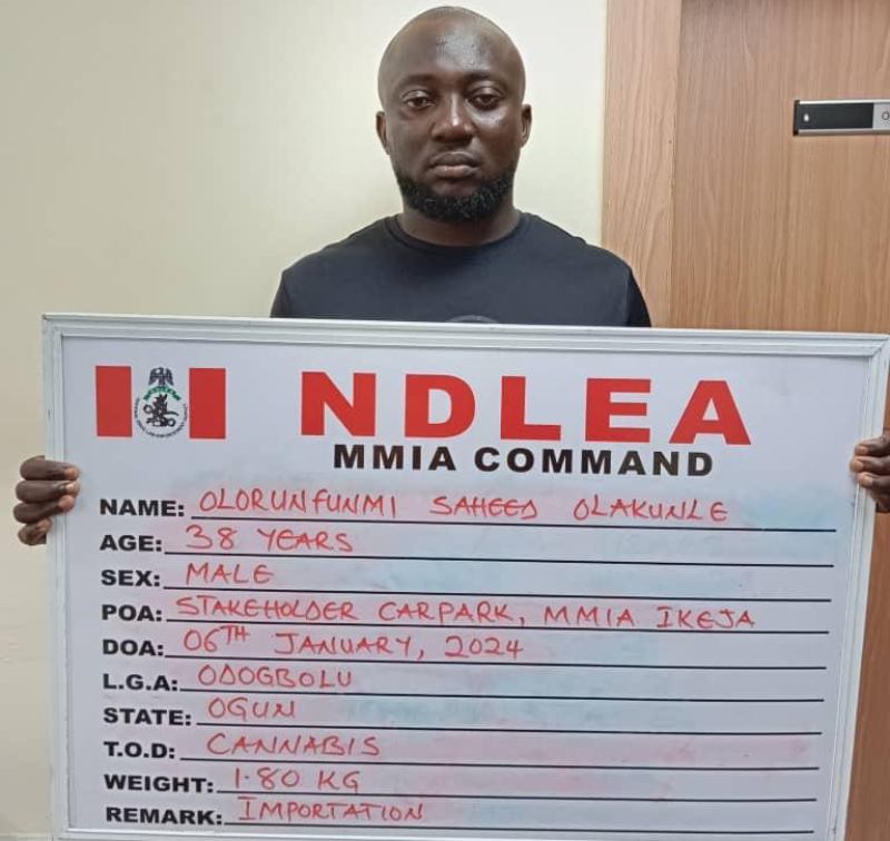 A weeklong intelligence-led operation to get the receiver arrested was consummated on Saturday 6th January following the successful tracking and arrest of 38-year-old Olorunfunmi Saheed Olakunle who distributes the dangerous psychoactive substance to dealers across Lagos state. The consignment had arrived the country on Monday 1st January via Cairo on Egypt Airlines flight marked as boxing kits.