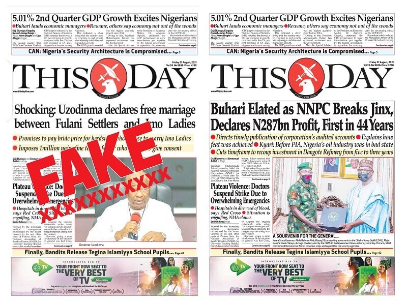 "With the headline: “Shocking: Uzodinma declares Free Marriage Between Fulani Settlers and Imo Ladies”, this fake version of our digital edition is being circulated on WhatsApp, Facebook, and other social media platforms.