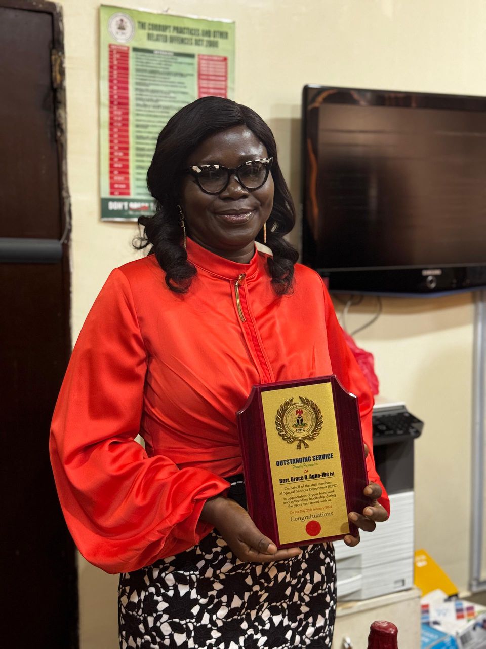 The Independent Corrupt Practices and Other Related Offences Commission (ICPC) has honoured Barr. Grace Agha-Ibe, fsi, as she retired from her position as Director, Proceeds of Crime Department (POCD), describing her exit as glorious and well-deserved after 24 years of dedicated service to the Commission.