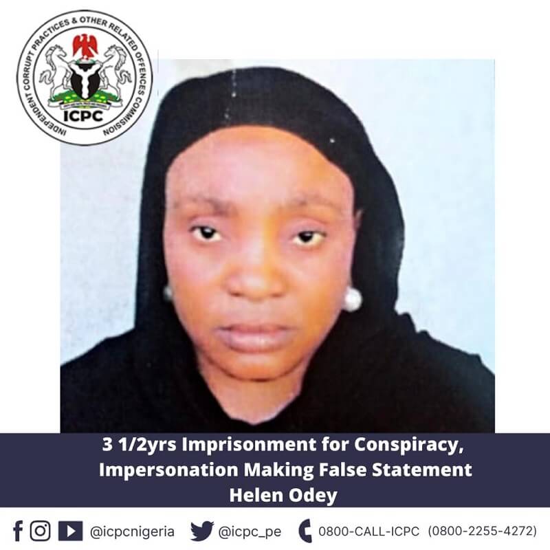 However, after ICPC had proved its case beyond a reasonable doubt, the trial judge found the duo guilty on count 1 and sentenced them to 6 months imprisonment and a sum of N200,000 naira fine each. On count 2, Justice Aboki found the first defendant (Helen Odey) guilty and sentenced her to 2 years imprisonment and a N500,000 naira fine.