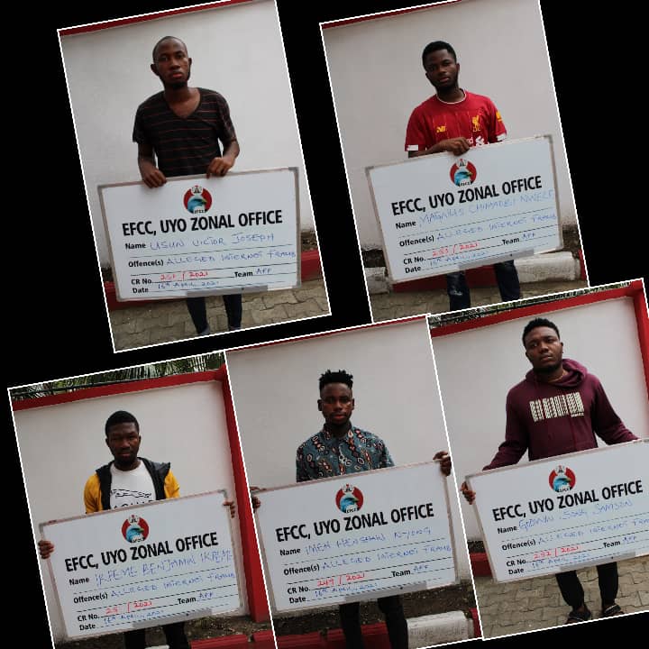 Operatives of the Uyo Zonal Office of the Economic and Financial Crimes Commission, EFCC, on Friday, April 16, 2021, arrested one Imeh Henshaw Nyong, a music producer and four others for alleged internet fraud in Uyo, Akwa Ibom State.