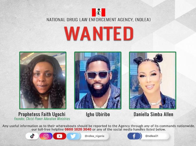 The National Drug Law Enforcement Agency, NDLEA, has declared a Port Harcourt, Rivers state based popular prophetess and founder of Christ Power Adoration Ministries, Faith Ugochi and a celebrity couple: Igho Ubiribo and Danielle Simba Allen wanted for recruiting teenage girls into drug trafficking while they serve as the arrowheads of an international syndicate operating from Los Angeles, USA.