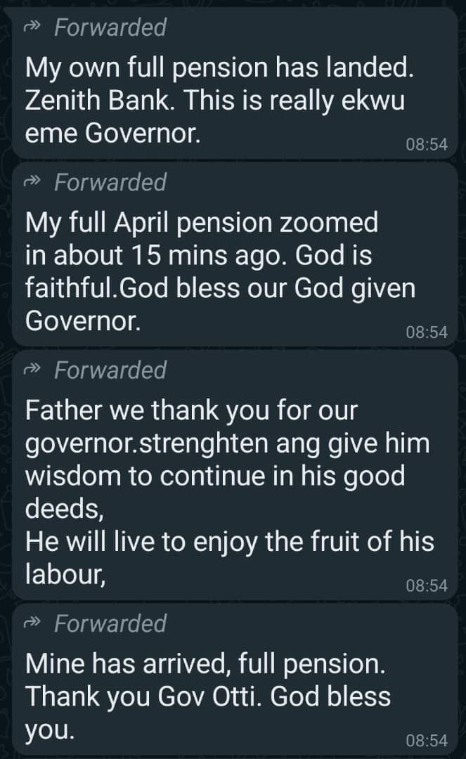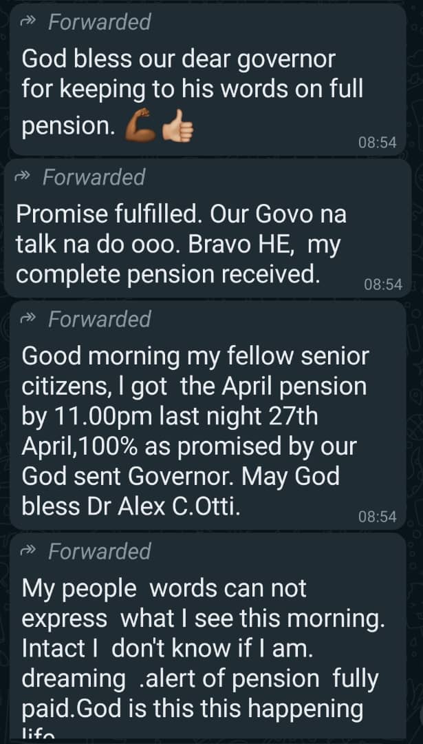 AS earlier promised by Governor Otti that pensioners in Abia would henceforth, on or before the 28th of every month, beginning this April, will be receiving their full pensions, the pensioners have since Saturday, April 27, 2024 started getting alerts for their entitlements.