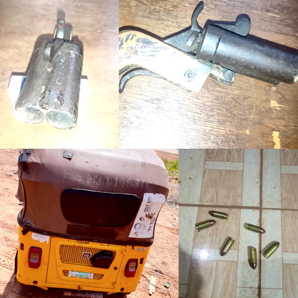 "During a thorough search, a locally fabricated double-barrel pistol was recovered from two occupants of the vehicle. The suspects, identified as Ugochukwu Samuel (male, aged 26) and Kevin Kosichukwu (male, aged 26), were promptly arrested, and the tricycle was recovered.