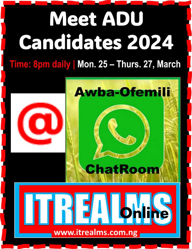 The international multiple award-winning, ITREALMS Media group, is collaborating with Awba-Ofemili ChatRoom to organise a week-long ‘Meet ADU Candidates 2024’ on social media for the forthcoming Awba-Ofemili Development Union (ADU) general elections aspirants.